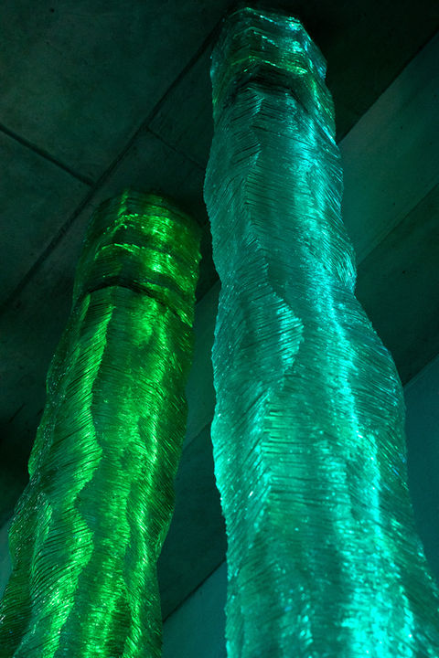 A thin led wire extends along the back of each trunk, bringing out the fractured character of the glass layers and accentuating the slightly convexed form of the trunks. It offers the opportunity to change hues and, thus, the atmosphere of the foyer. Technically, the led wire was the best solution that rendered an even distribution of light across the whole sculpture.
