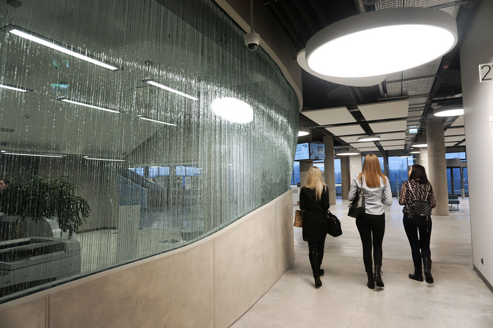Vertically layered glass wall "Motus" separates the student information centre from the rest of the vast open-plan ground floor. Nevertheless, it functions inconspicuously and elegantly, making the space feel like part of the whole interior symphony rather than an appendix.